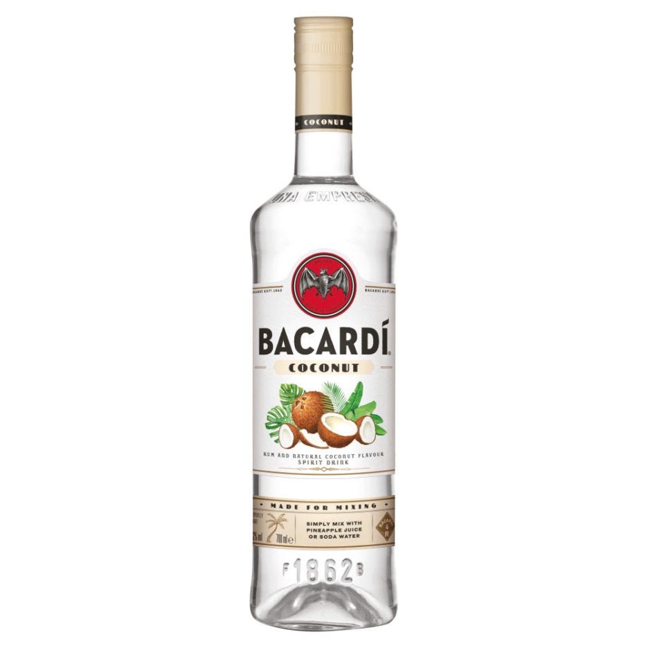 Description: Bacardi Coconut Rum Spirit Drink is a deliciously flavored rum that brings the tropical taste of coconut to your glass. With Bacardi's signature smooth rum as its base, this spirit is infused with natural coconut flavor, creating a sweet, refreshing drink perfect for summer cocktails. Whether you're sipping it on its own over ice or mixing it into a Piña Colada, Mojito, or tropical punch, Bacardi Coconut Rum adds an exotic twist to any occasion.