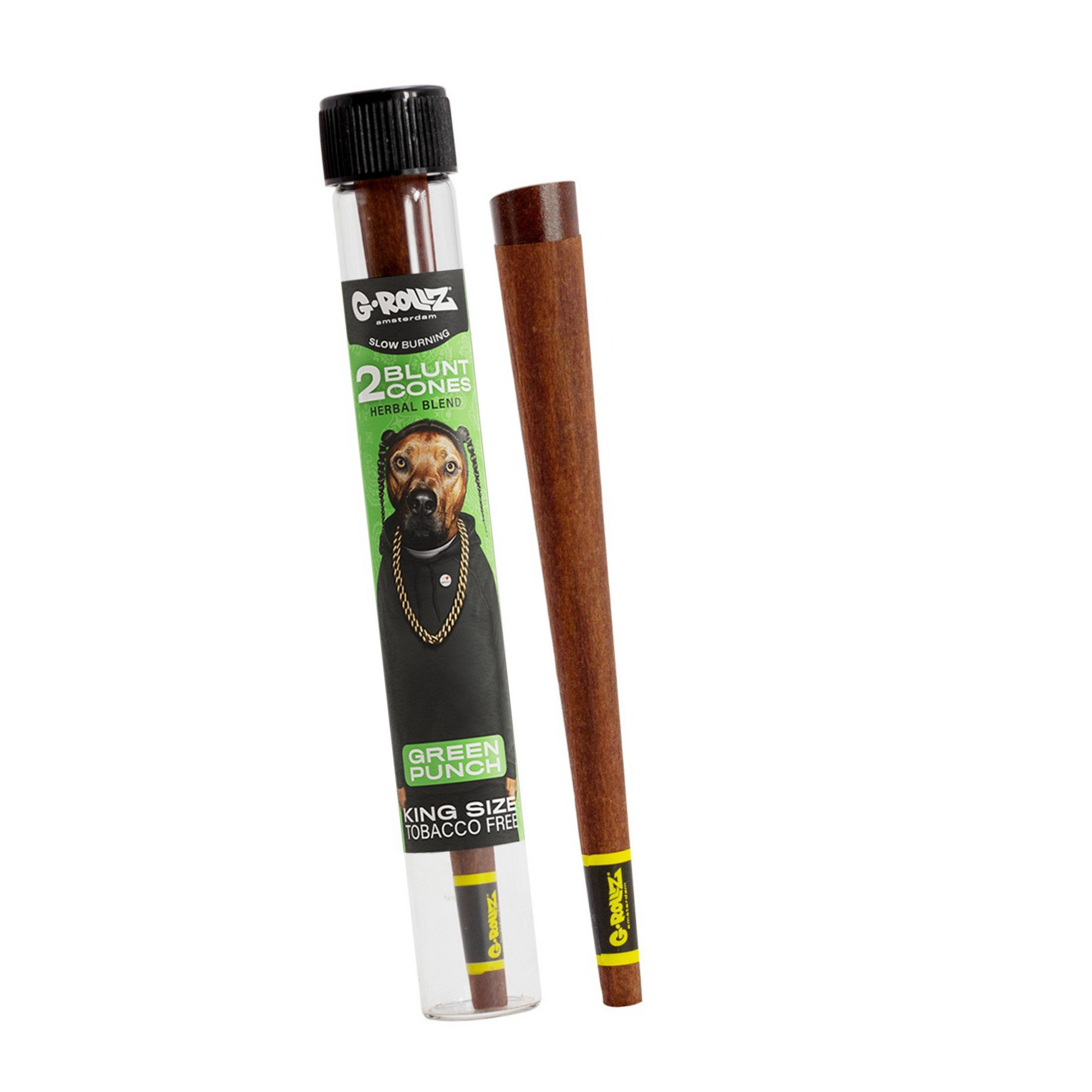 G-Rollz - The Dog-Terpene Infused Herbal Blunt Cones Green Punch combine the best of flavor and quality in one unique product. These pre-rolled herbal blunt cones are infused with terpenes, offering a rich and vibrant Green Punch flavor that enhances your smoking experience. Made with natural, high-quality paper, these cones provide a smooth, slow burn that maximizes your enjoyment. Perfect for those looking for a terpene-infused, flavorful herbal smoke.